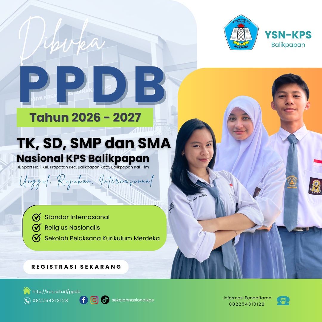 Assalamualaikum Warahmatullahi Wabarakatuh, selamat pagi, salam sehat dan salam sejahtera untuk kita semua. Terima kasih atas kepercayaannya merencana dan menyekolahkan ananda di YSN-KPS Balikpapan.  Sekolah Nasional KPS membuka pendaftaran Peserta Didik baru Tahun Pelajaran 2026/2027 dan tahun 2027/2028 untuk KB-TK, SD, SMP dan SMA Nasional KPS. Cara pendaftaran peserta didik baru, Ayah Bunda dapat mengisi form melalui link di bawah . Selanjutnya ikuti petunjuk yang ada pada form pengisian data. Ayah Bunda, terima kasih telah mempercayakan  Ananda untuk bersekolah di sekolah Nasional KPS. Setelah mengisi link ini, pihak sekolah akan segera berkomunikasi dengan ayah bunda. Semoga ananda selalau sehat dan sukses dalam belajarnya.Â